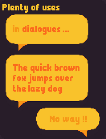 Chat is a 11x15px pixel art font that works in many UI elements like dialogues, menus, statistiques.